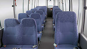 Coaster boasts a sense of timeless style. A front bumper and grille complement headlamps and indicator lights, resulting in a sleek exterior. Inside there is a clever instrument panel design, eye-catching upholstery (passenger seats Deluxe grade only) and storage space (Deluxe grade). From the moment passengers step on board through the automatic sliding door (Deluxe grade), they’ll notice the difference.